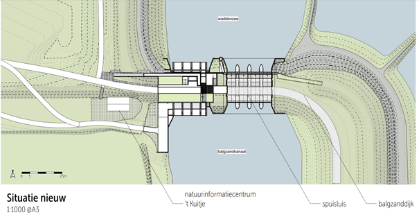 The inflow and outflow width on both the Wadden Sea and Balgzand sides will be increased. The 't Kuitje nature education center will be retained. The HHNK bulkhead shed and the reserve sluice gates of the drainage sluice will be removed.